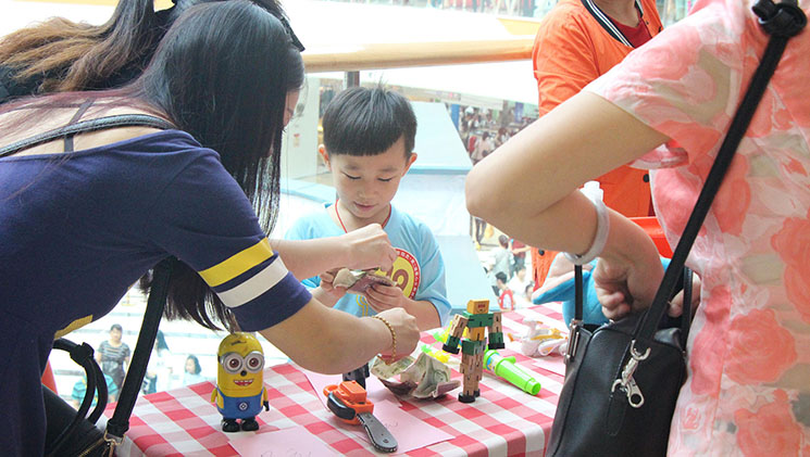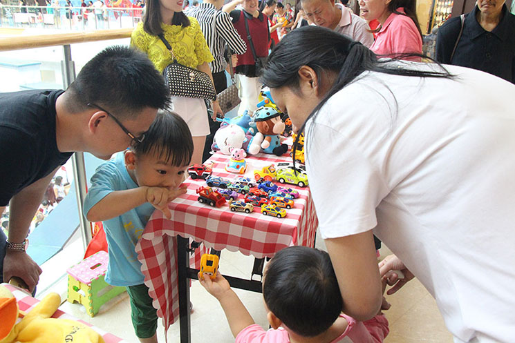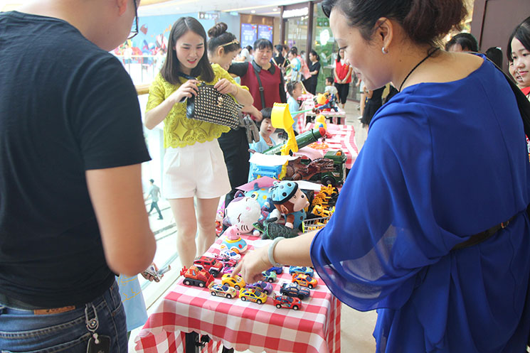 参加此次义卖活动的小朋友在家长们的陪同下,拿出自己的闲置玩具和手工作品,在跳蚤市场上摆摊销售。除了玩具公仔、文具、漫画、还摆卖着小朋友自己亲手制作的手工艺品、纪念品,不少过往的行人纷纷驻足,争相购买。