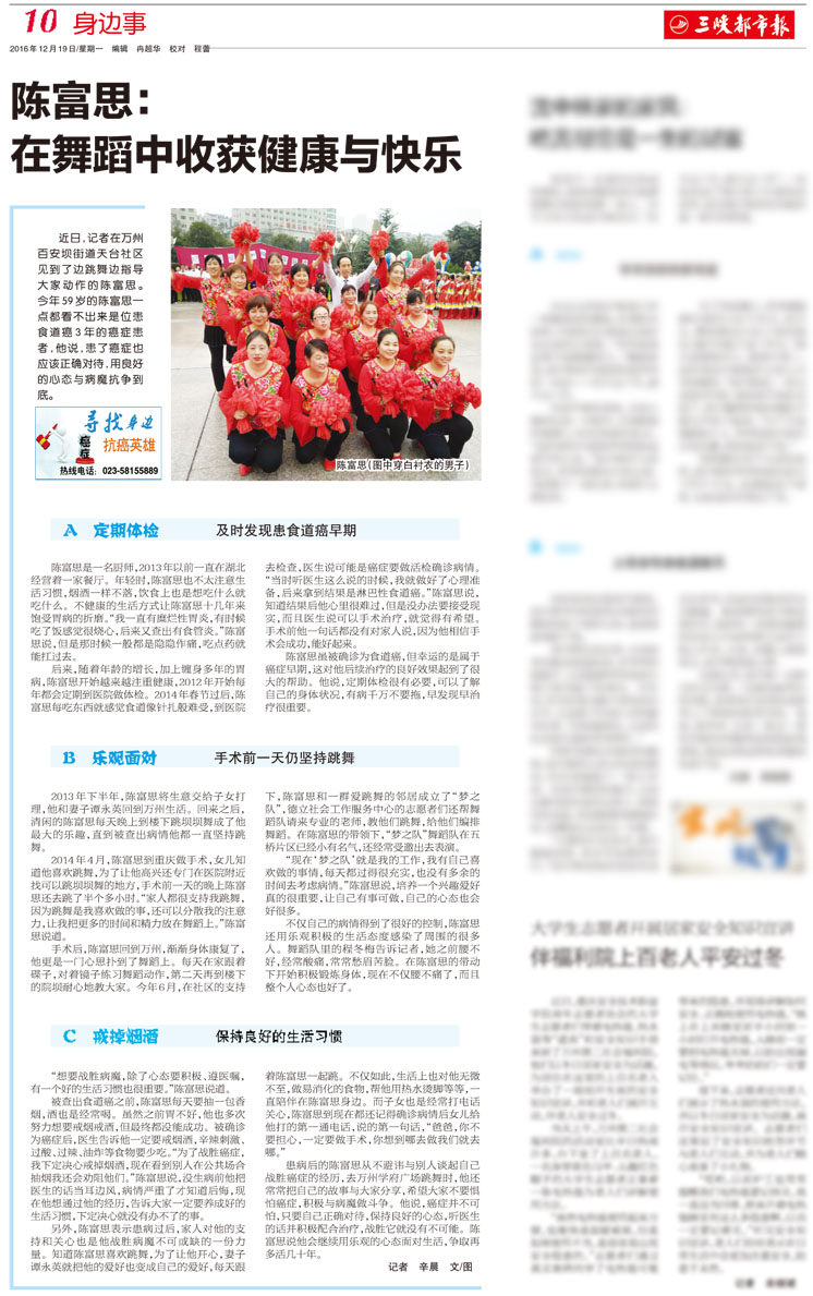 近日,记者在万州百安坝街道天台社区见到了边跳舞边指导大家动作的陈富思。今年59岁的陈富思一点都看不出来是位患食道癌3年的癌症患者,他说,患了癌症也应该正确对待,用良好的心态与病魔抗争到底。