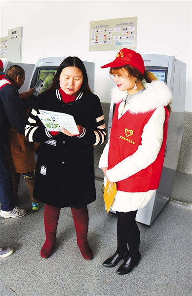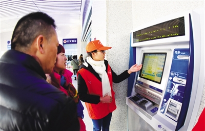 此时,售票大厅的各个自动售取票机前已排满了乘客。“小妹妹,我不会购票,你能帮我吗?”一位大姐向售取票机旁的志愿者问道。