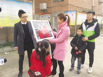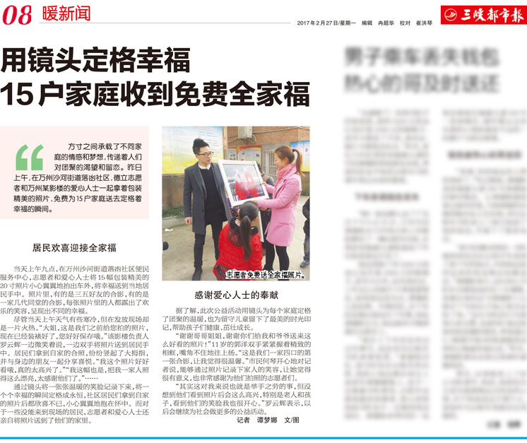 当天上午九点,在万州沙河街道落凼社区便民服务中心,志愿者和爱心人士将15幅包装精美的20寸照片小心翼翼地抬出车外,将幸福送到当地居民手中。照片里,有的是三五好友的合影,有的是一家几代同堂的合影,每张照片里的人都露出了欢乐的笑容,呈现出不同的幸福。