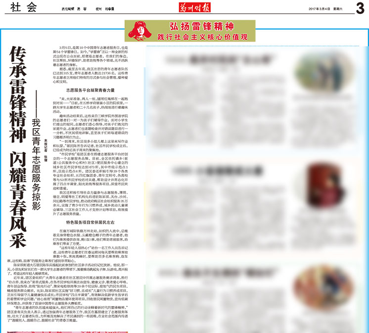 3月5日,是第18个中国青年志愿者服务日,也是第54个学雷锋日。如今,“学雷锋”正以一种全新的形式出现在公众面前,那便是志愿者。在我们的身边,社区帮扶、环境保护、助老助残等各个领域,无不活跃着志愿者的身影。