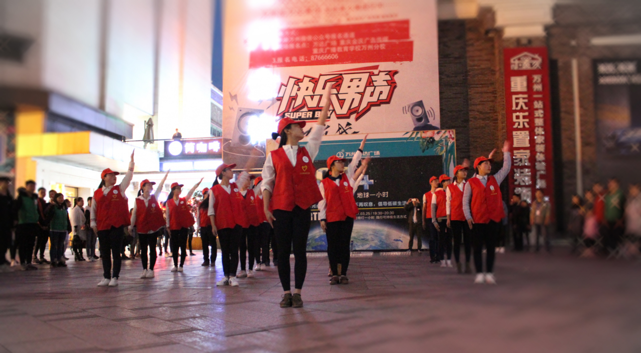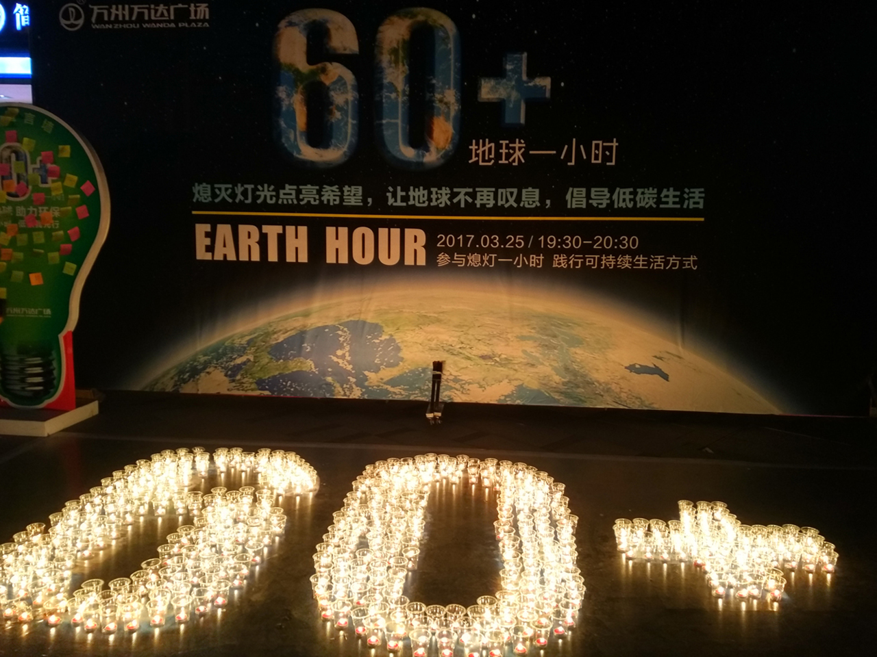 “熄灯一小时,节能又环保”。3月25日晚上19:30万州万达广场1号门的外景灯饰陆续暗降熄灭,志愿者们用蜡烛摆出并点亮了“60+”标志,至此,2017年“地球一小时”公益活动正式拉开了帷幕。