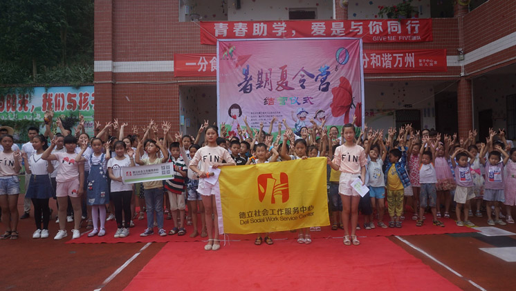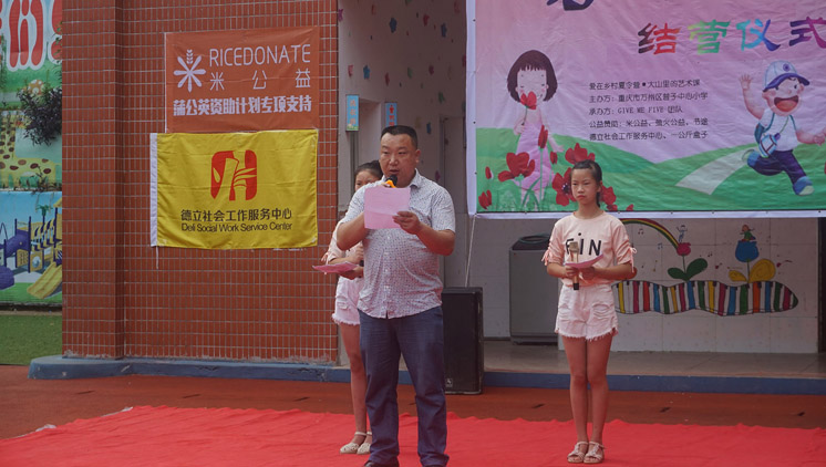 2017年7月30日上午,青春夏令营的结营仪式成功在普子幼儿园举办。本次结营仪式由参加此次夏令营的82位小朋友共同主办,GIVE ME FIVE团队承办,萤火助学、德立社会工作服务中心、米公益、一公斤盒子以及书途协办。普子中心小学校长张建辉、德育处主任宋国族,德立社会服务中心张洁,及社会爱心人士陈先生莅临了此次结营仪式。