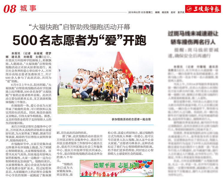 据了解,此次慢跑活动由重庆市万州区启智社会服务中心、重庆市万州区志愿者服务工作指导中心联合主办,重庆市万州区德立社会工作服务中心、重庆万州技师学院共同承办。今年,是启智助残慢跑活动成功举办的第八个年头。