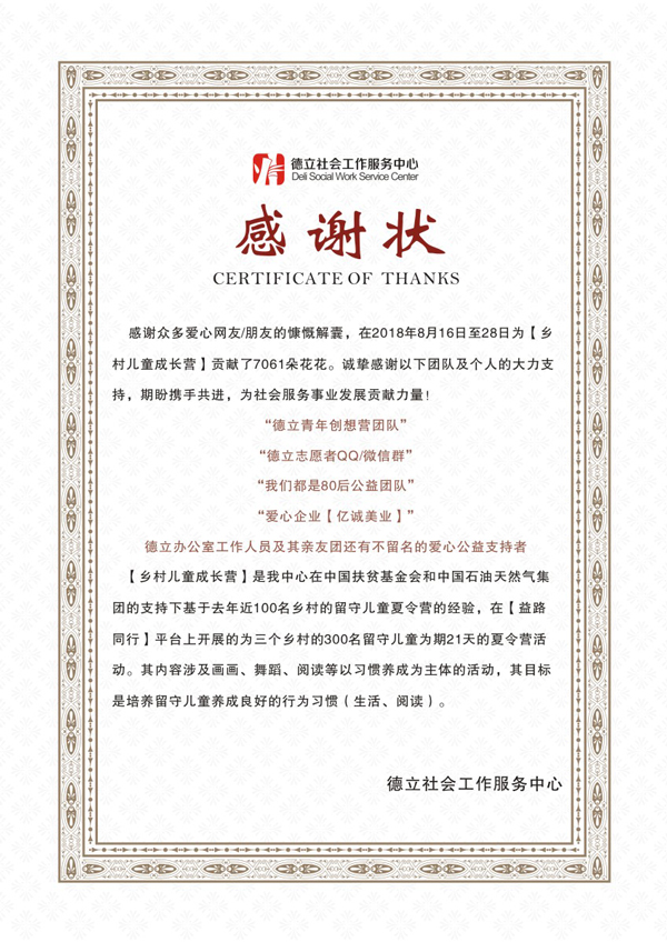 为感谢2018年8月16日至28日众多爱心朋友对我们在【益路同行】公益平台上的【乡村儿童成长营】项目的支持,特制感谢状来表达我们对您们的感激之情。关注我们的网站会公布执行过程和结果。